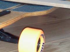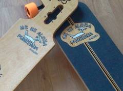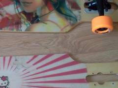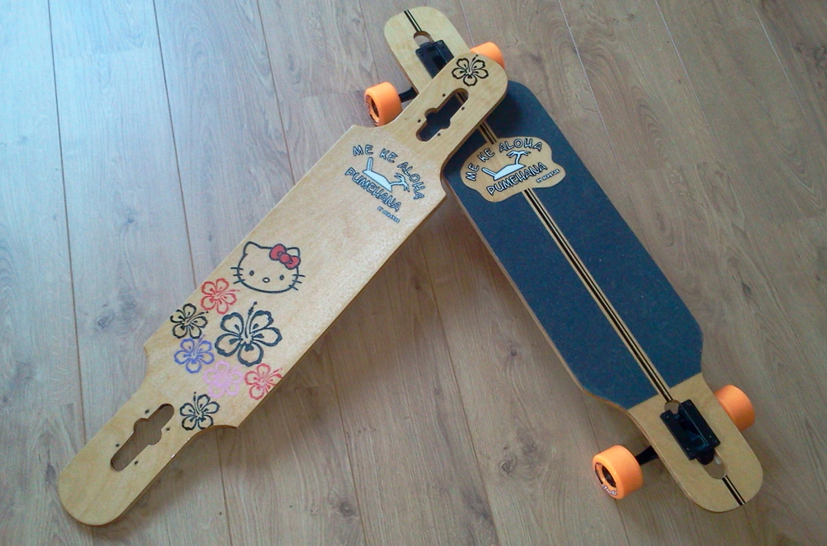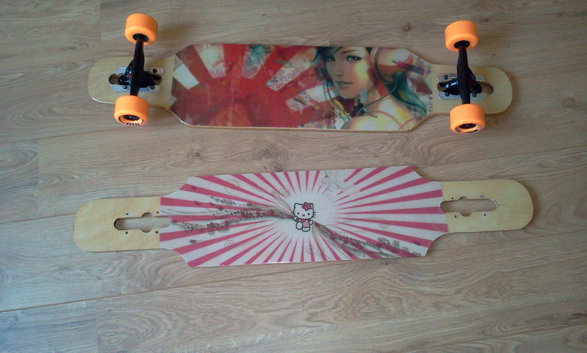 03 09 12 - 08:47 Da meine Tochter so ziemliches Interesse an meinen Freizeitbeschäftigungen zeigt, musste für sie nun auch ein Longboard her.Das habe ich gleich zum Anlass genommen 2 Freereider für uns zu bauen. Aber diesmal sollte es wieder einen Schritt weiter in der Fertigungstechnik gehen. GFK-verstärkte Boards sollten es werden. Also habe ich erst einmal Epoxydharz (bei der Verarbeitung unbedingt Handschuhe und Atemschutz tragen ) und verschiedenen Glasfasergelege gekauft. Dazu dann noch zwei große Platten Birkensperrholz 4mm und los ging es. Holzrohling geklebt, Unterseite auflaminiert - und wieder ab in die Presse. Oberseite laminiert und noch einmal pressen. Die Bilder auf der Unterseite sind auf 80g/m² - Papier gedruckt und unter Finishergewebe einlaminiert. Das Dekor auf der Oberseite sind Aufkleber, welche unter einer Schicht Epoxyd, beziehungsweise bei dem Kittyboard unter Finishergewebe aufgebracht sind. Das Kittyboard hat auch Clear-Grip mit Fepa 40 Edelkorund aufgebracht.