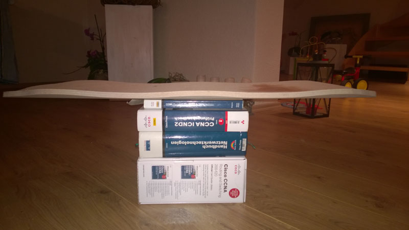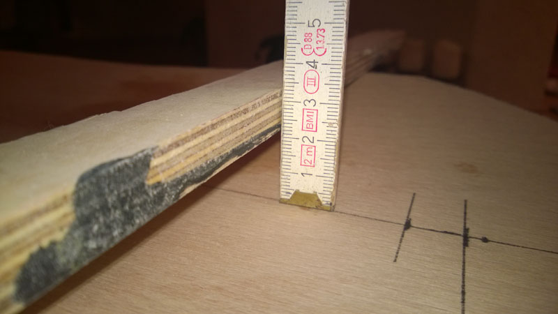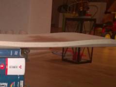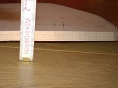So um Wiehnachten war es dann soweit. Es konnte wieder gebastelt werden. Diesmal sollte sich die Konkave auf der Länge des Brettes ändern um so die Füße richtig schön zu umschließen. Also habe ich mich erst mal auf ein großes Blatt Papier gestellt und einen Fußabdruck von meinem Tuck gemacht - diesen dann vermessen und auf das Shape übertragen. Dabei stellte sich heraus, dass ich schön auf dem ca.88cm langen Brett stehen könnte. Der nächste Schritt der Planung betraf die Höhe der Flares. Da ich mir überlegt hatte an dem neuen Board eventuell POGO Raceplates zu verbauen muß an den Stellen der voraussichtlichen Wheelwells zuätzlich mehr Konkave sein, um genügend Platz für die Rollen zu schaffen - passt ja auch Wunderbar zur Idee der veränderlichen Konkave am Brett. Ich habe dafür meine alte Balkenpresse geschlachtet und neu zusammengesetzt. Auf Höhe der Flares und in der Taille würden 2,4cm starke Holzleisten und auf Höhe der Taschen 1,5cm starke Holzleisten verbaut. Zuätzlich zum Mittelbalken würden die Ränder des Rohlings noch mit Schraubzwingen in Form gebracht - funzt.... Da ich mir bei der ganzen Sache nicht ganz sicher bin, habe ich erst einmal einen Prototypen aus Buche gebaut. Das endgültige Board soll aus Birke mit Schaumkern sein.