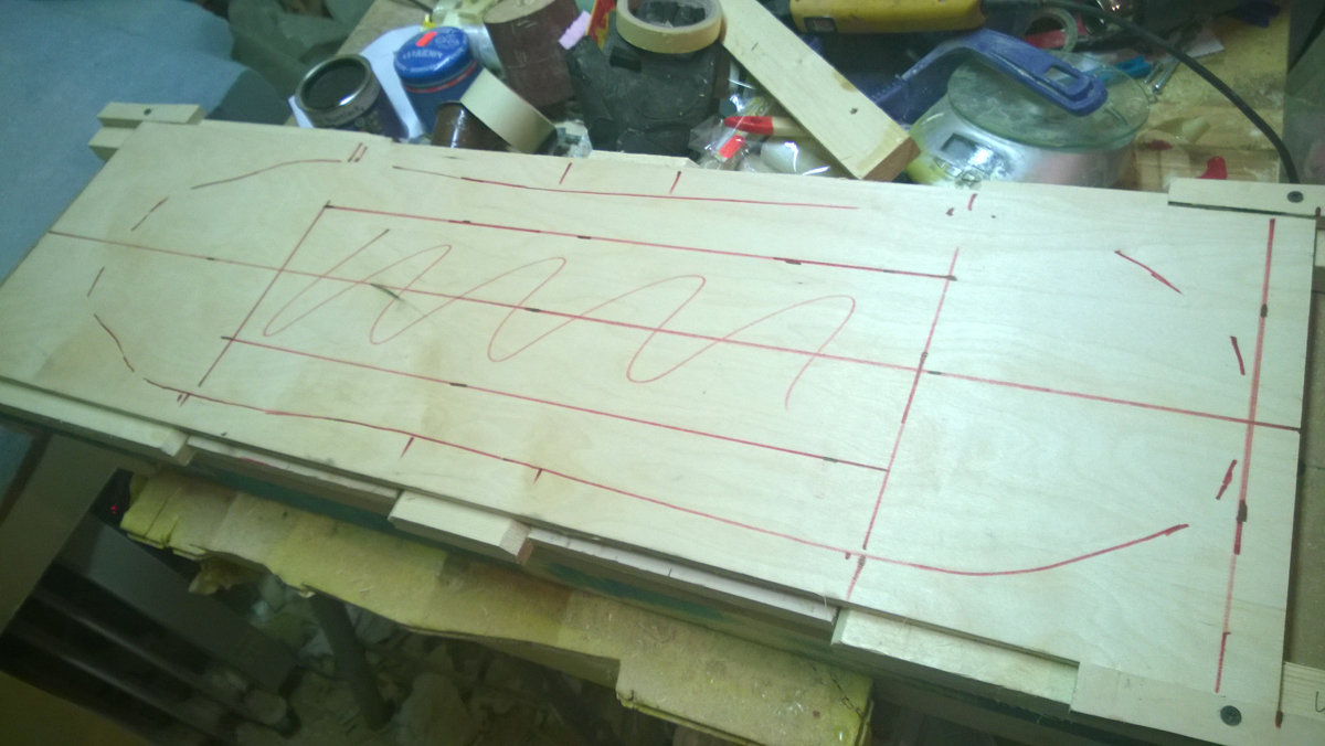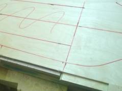 Als erstes habe ich alles ordentlich ausgemessen und Hilfsmarkierungen auf allen Platten aufgezeichnet. Dann habe ich auf das obere 2mm Birkenholz das Shape und auf das untere die Markierungen für die Achsbohrungen übertragen. Nun habe ich auf die 4mm Birken-Platten das Shape übertragen, den Aussschnitt für den Foam-Core aufgezeichent.