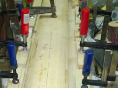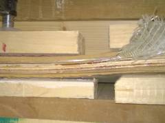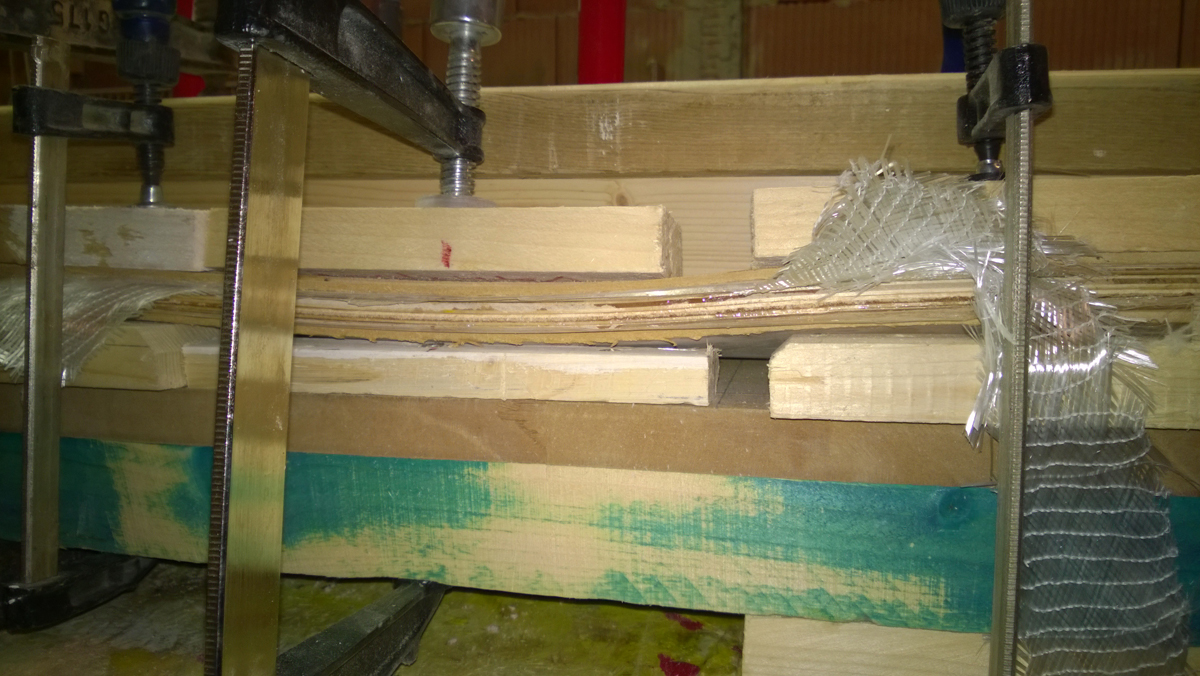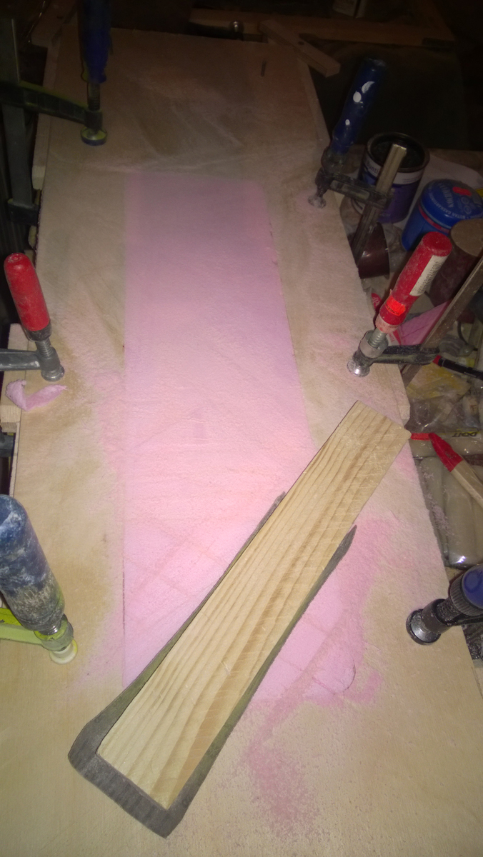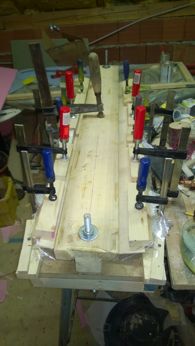 Dann die Platten zusammenschrauben, damit ja nichts verutscht und den Ausschnitt aussägen. Foam einpassen und dann sind wir mit den Vorbereitungen schon fast fertig. . Ich weiß - da jätte noch bedeuten mehr Holz in der Mitte weggekonnt. aber schon das bischen bringt auf dem Papier 380gr (400gr Holz raus - 20gr Styrodur rein). So jetz noch das Biax zurechtschneiden und alles zurechtlegen - dann kann es schon an das Laminieren gehen. Die Press- / Druckveteilplatten mit Folie bespannt, Harz angemischt und dann schön durchlaminiert. Obere Pressplatten drauf und dann den Mittelbalken gleichmäßig vorne und hinten angezogen. Die Vertiefungen und Erhöhungen am Rand habe ich zusätzlich noch mit Schraubzwingen heruntergezogen um das besser abzuformen. . Jetzt heißt es 24h warten und dann kann der Rohling aus der Presse....